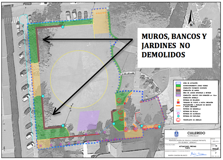 Recordamos que el proyecto menciona específicamente que "....se ha contemplado la demolición de los muros de hormigón armado que delimitan perimetralmente la actual Plaza y que sirven de bancos. De este modo se conseguirá una definición... mas diáfana e integrada en el entorno dado que se adaptarán las superficies ajardinadas existentes a las nuevas cotas del pavimento renovado...".